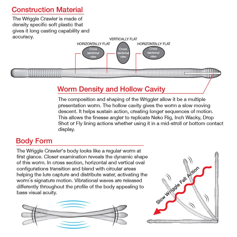 Realis Wriggle Crawler, der Wriggler, der zum Leben erwacht. Der Wriggle Crawler’s horizontale und vertikale ovale Querschnitte, sowie seine kreisförmigen Formen geben enge intensive Wellenaktion, die den Wurm buchstäblich zum Leben erweckt.DUO’s Absicht war es, einen mehrdimensionalen Finesse-Wurm zu schaffen, der mit mehrfacher Aktion und Vibration ausgestattet ist. Finesse-Angler werden sofort die Vielseitigkeit und Nützlichkeit des Wriggle Crawlers erkennen.• Länge: 12cm• 20pcs