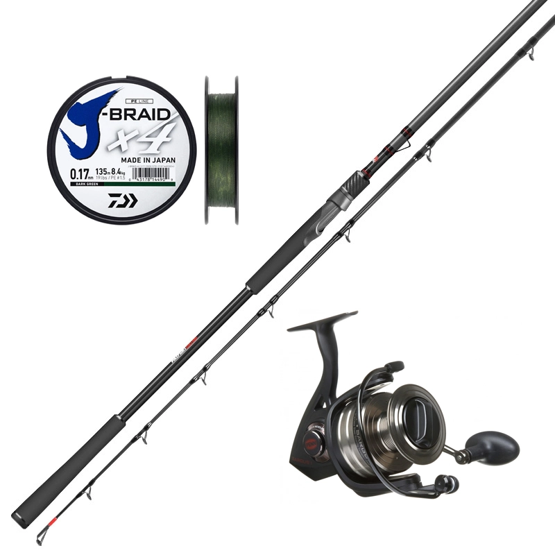 Eine robuste Combo mit unserer Grim Reaper Pitch Black und einer Penn Sargus 2 Rolle, das ist Hardcore auf ganzer Linie!RuteDie Pikefight V2 Rutenserie ist eine Top-Serie mit Titanium Ringen, japanischen 40T Toray Carbon Blanks mit 1k Carbon Verstärkung. Dies sind erstaunliche Ruten für das Hechtangeln, schwere, schnelle Aktion, die es den Blanks erlaubt, sich aufzuladen und Ihnen lange und präzise Würfe zu ermöglichen! Ti-Forged Guides, Rollenhalter von American Tackle und geteilter EVA-Griff.Ti-Forged Guides:Korrosionsschützendes Rahmenmaterial, gehärtete Rahmen für extreme Festigkeit, Anti-Tangle Snagless Frame Design, Nanolite oder Duralite braid-proof Ringe, Slim Profile Ringe reduzieren das Gewicht und sorgen für mehr Wurfweite und längere Schnurlaufzeiten.PikeFight V2 Spinning 8’6” 110g 2pc• Länge: 8’6”• Länge hinterer Griff (ab Rollenhalter): 43cm• Wurfgewicht (bis): 110g• Teile: 2 Stück• Gewicht: 209g• Aktion: Heavy FastRolleEngineered in Japan, die nächste Generation der meistverkauften Rollenserie ist da!Gebaut, um mehr Distanz beim Werfen und verbesserte Zugkräfte zu erreichen.• Vollmetallgehäuse• Techno balanced rotor• Einführung einer neuen 2500er Größe• Abgedichtete 5+1 Kugellager• Abgedichtetes Filzbremssystem• Line Capacity RingsLineDie J-Braid Geschichte geht weiter mit der Ankunft der X4, einer viersträngigen Konstruktion. Hergestellt in Japan und unter Beibehaltung des runden Profils der X8 Version, ist J-Braid X4 von 0,07mm bis 0,33mm erhältlich. Die Farbauswahl reicht über gelb, dunkelgrün und mehrfarbig in verschiedenen Spulengrößenoptionen.Bruchfestigkeit• 0,29mm – 41lbs/18,6kg• 0,33mm – 50lbs/22,4kg